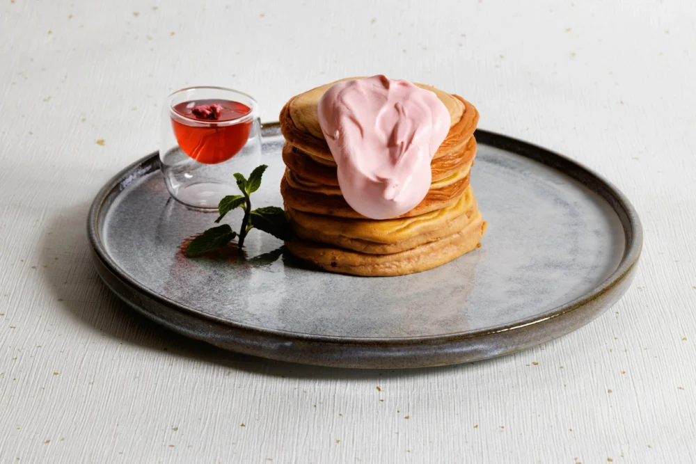 Pancakes with slightly cherry blossoms are added with smooth fresh cream and cherry sauce to create a spring-like color.